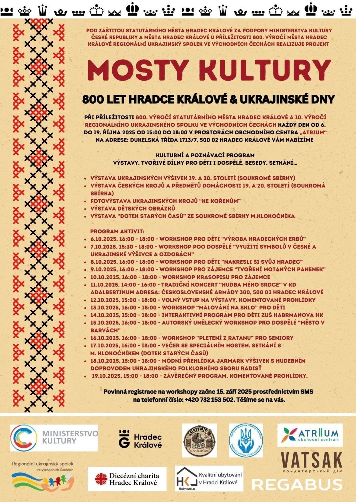 Představení výšivek, malby a zručnosti ukrajinských umělců bylo možné vidět v centru Atrium. V sále Adalbertina pak 11.10.2025 vystoupily ukrajinské děti, sbor Radost a další hosté.