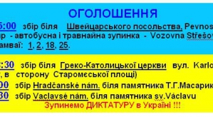 Збір о 15:00 Hradčanské nám. біля пам'ятника Т.Г.Масарика ( УВАГА !!! Звідтам поїде группа людей до Швейцарського посольства, Pevnostní 588/7, Praha 6 ).