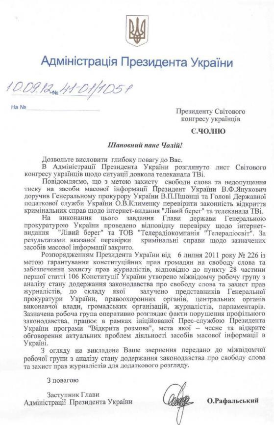 Лист заступника Глави Адміністрації Президента України О. Рафальського, що надійшов у відповідь на звернення Світового Конґресу Українців до Президента Віктора Януковича у справі українського телеканалу TVi.
