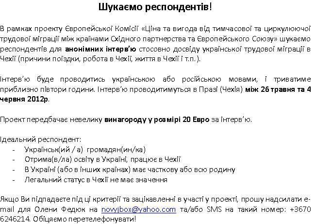 В рамках проекту Європейської Комісії «Ціна та вигода від тимчасової та циркулюючої трудової міграції між країнами Східного партнерства та Європейського Союзу» шукаємо респондентів для анонімних інтерв'ю стосовно досвіду української трудової міграції в Чехії (причини поїздки, робота в Чехії, життя в Чехії і т.п.).