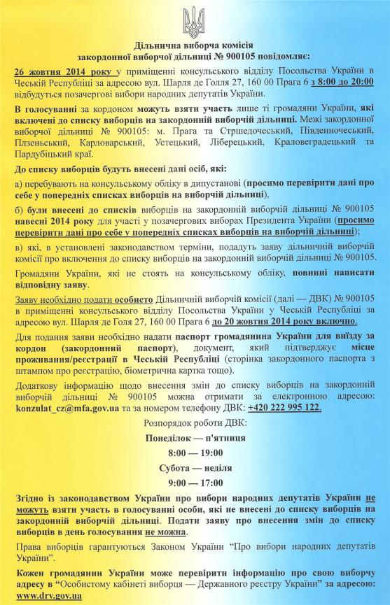 26 жовтня 2014 року у приміщенні консульського відділу Посольства України в Чеській Республіці за адресою вул. Шарля де Голля 27, 160 00 Прага 6 з 8:00 до 20:00 відбудуться позачергові вибори народних депутатів України.