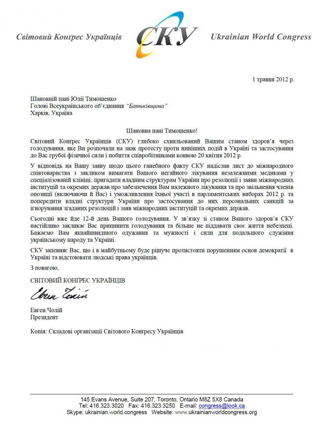 Світовий Конґрес Українців (СКУ) глибоко схвильований Вашим станом здоров'я через голодування, яке Ви розпочали на знак протесту проти нинішніх подій в Україні та застосування до Вас грубої фізичної сили і побиття співробітниками конвою 20 квітня 2012 р.