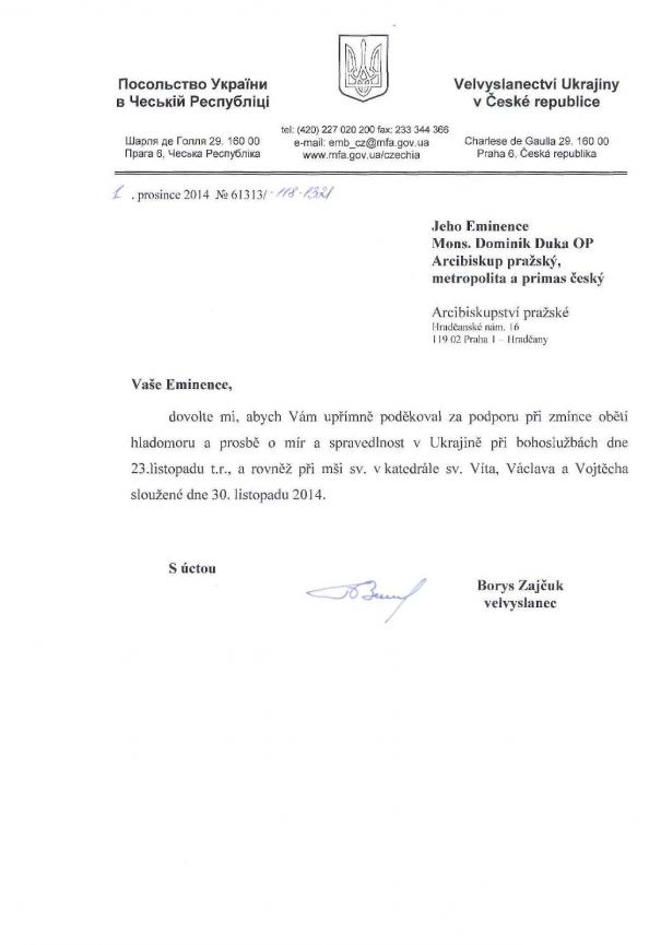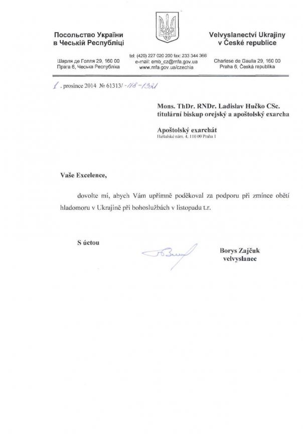 Подяки главам Католицької, Греко-католицької та Православної церков ЧР за підтримку в проведенні богослужб за жертвами Голодомору, за справедливість