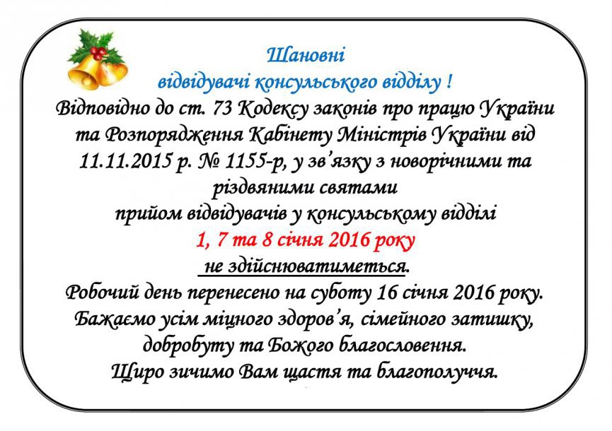 Інформація для відвідувачів консульського відділу Посольства про вихідні дні у січні 2016 року.