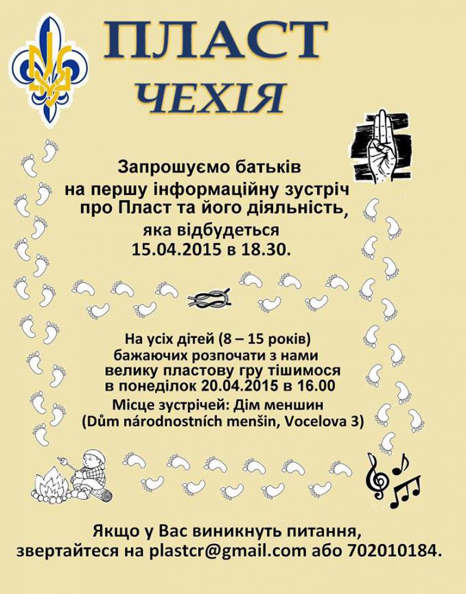 Сердечно запрошуємо всіх, які бажають дізнатися більше про Пласт у Празі. Приходьте, поширюйте!