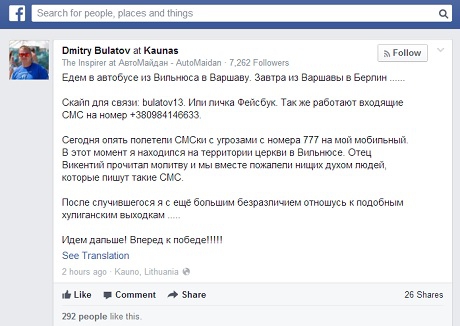 "Сьогодні знову полетіли смски з погрозами з номера 777 на мій мобільний. На той час я перебував на території церкви у Вільнюсі. Батько Вікентій прочитав молитву, і ми разом пожаліли убогих духом людей, які пишуть такі смс", - написав Булатов.