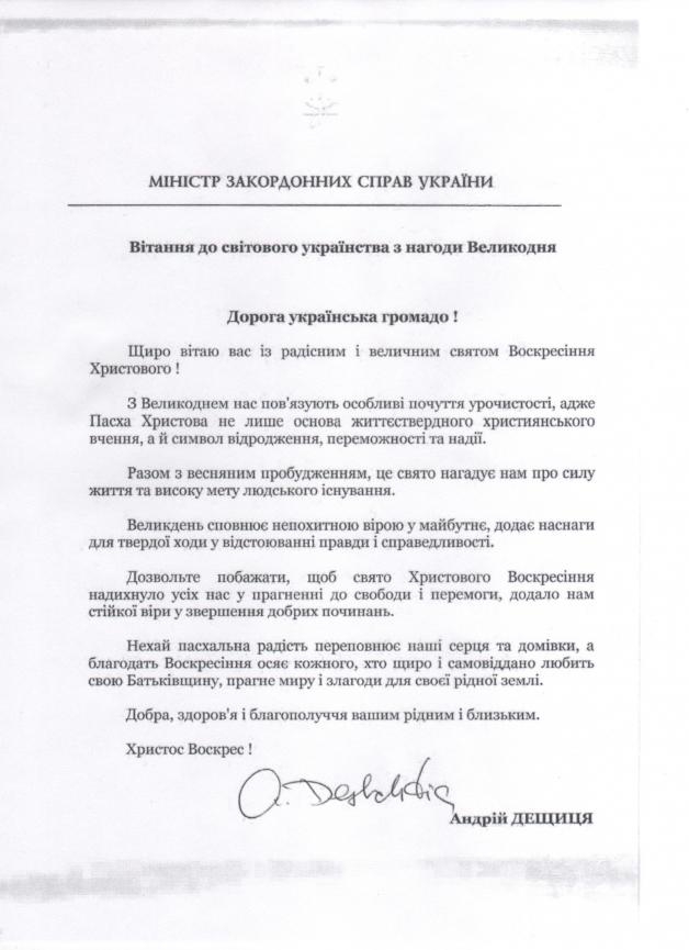 Вітання В.о. Міністра закордонних справ України А.Б.Дещиці до світового українства з нагоди Великодня
