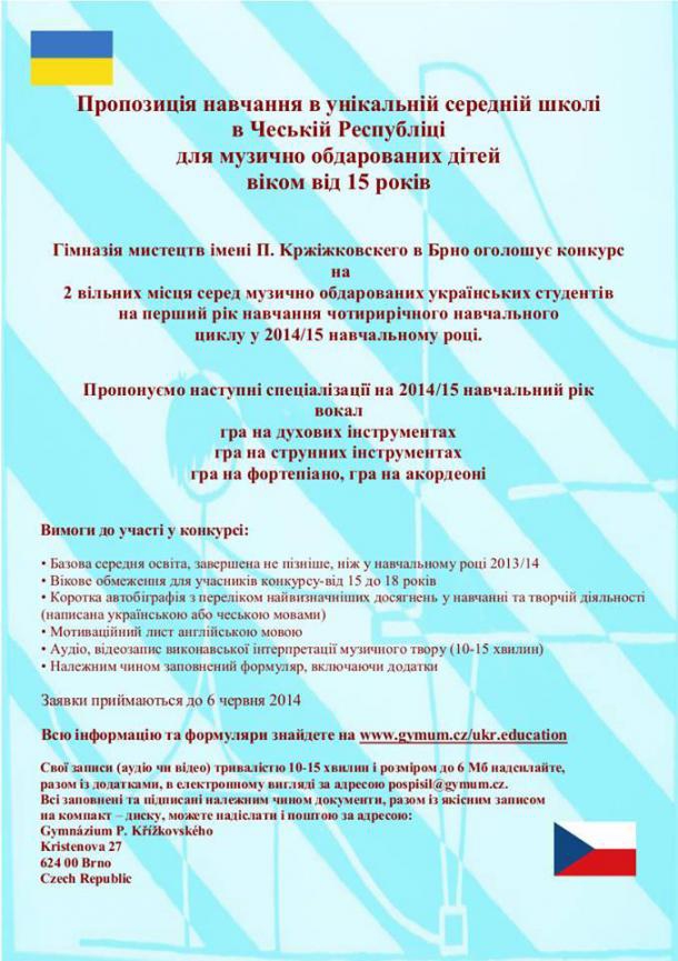 Гімназія мистецтв імені П. Kржіжкoвскего в Брно оголошує конкурс на 2 вільних місця серед музично обдарованих українських студентів на перший рік навчання чотирирічного навчального циклу 2014/15 навчального року.