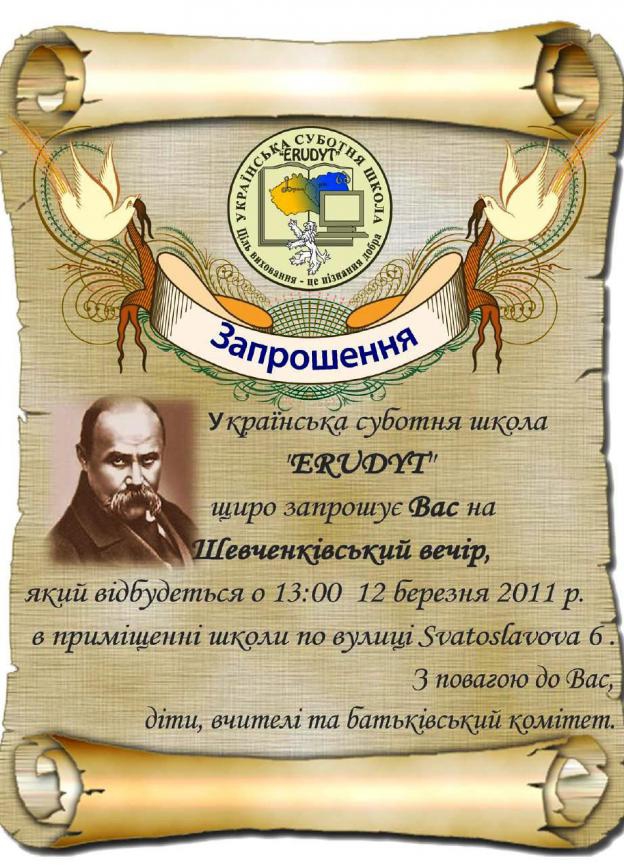 Українська суботня школа "Ерудит" щиро запрошує Вас на Шевченківський вечір,